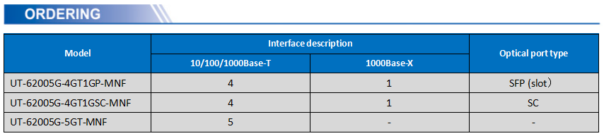 UT-62005G series 5-port full Gigabit managed Ethernet switch contains 5 Gigabit interfaces, supporting 4 10/100/1000Base-T and 1 port optical optional. The Ethernet switches are highly flexible and can transmit data over long distances via fiber optic ports. The series switches support multiple management functions (CLI/Web/Console port, etc.), expandable backbone network structure and Power over Ethernet, and high EMI resistance to ensure stable operation in harsh industrial environments for industrial applications such as industrial automation, intelligent transportation, and video surveillance.